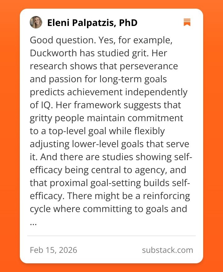 I recently asked Eleni Palpatzis, a neuroscientist studying cognition and ageing, and author of a newsletter on everyday brain function, about the relationship between goal setting, agency, and grit.